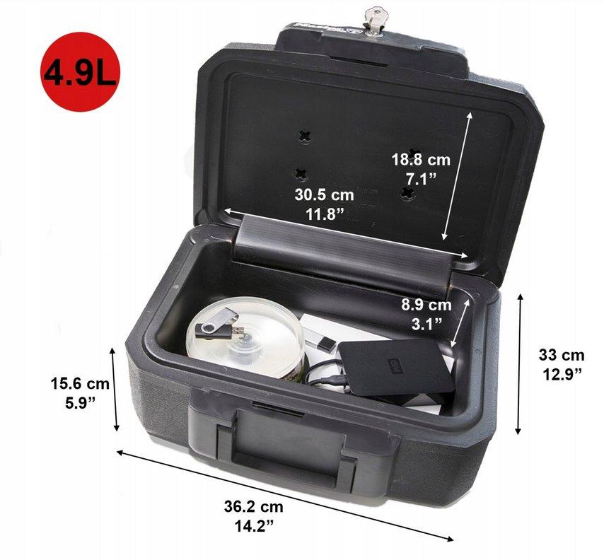 Uzamykateľný bezpečnostný kufor H0100EURHRO na cennosti je vhodný pre uchovanie digitálnych médií a písomností vo formáte A4, ako napr. dokladov či fotografií, drobnej elektroniky. Box má pevnú oceľovú konštrukciu, ktorá je certifikovane odolná voči ohňu (do 30 min) a vode (až 72 hodín). Kufor má aj praktické držadlo. Súčasťou balenia sú 2ks kľúčov.