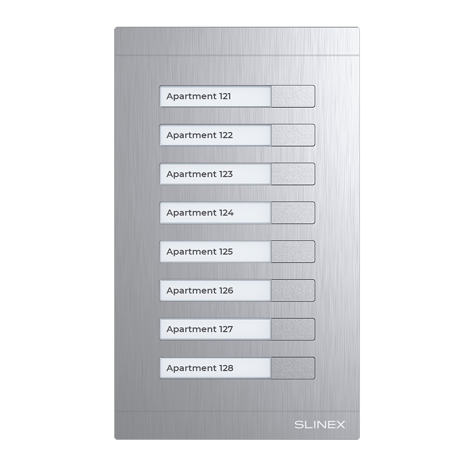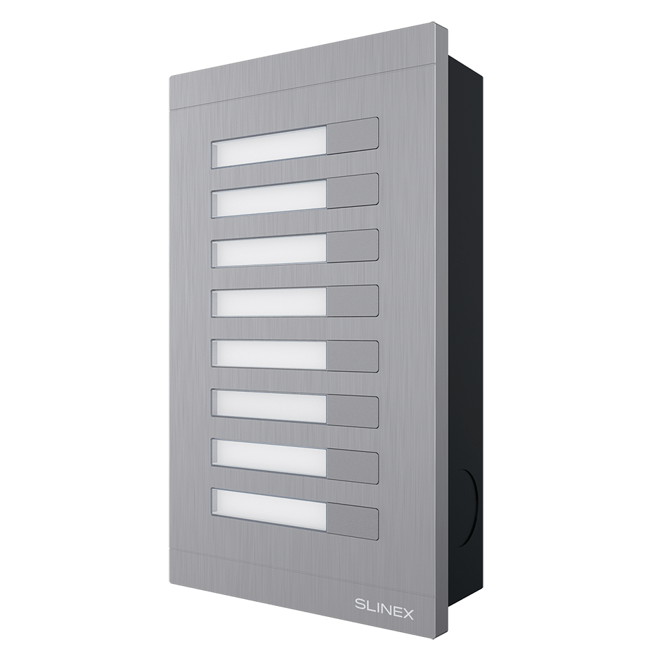 Slinex MA-08 je prídavný rozširujúci modul pre panely Slinex MA-01CRHD, MA-02CRHD, MA-03CRHD a MA-04CRHD. Pomocou tohto modulu môžete k uvedeným vonkajším panelom dodatočne pripojiť až 16 bytov (s pripojením dvoch modulov súčasne). Tento modul je univerzálnym riešením pre tých, ktorí potrebujú moderné vybavenie s možnosťou pripojenia malého počtu bytov na videovrátnikový systém alebo jeho dodatočné rozšírenie.